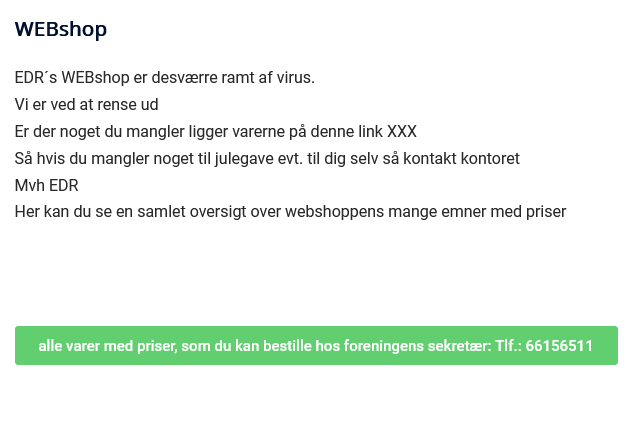 Webshoppen fungerer ikke. Når man klikker på shoppen mødes man med besked om, at man er ved at rydde op, og det har man været siden begyndelsen af november 2022.