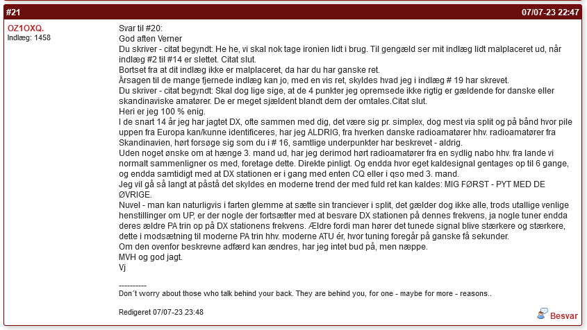 Bevares - jeg er medlem af EDR, men ser ikke EDR's hjemmesides indhold og Forum, som noget "positiv" i min søgen på informationer - disse finder jeg andre steder. Bevares - Jørgen//OZ0J - gør et kæmpe arbejde med at reklamere og opdatere kalenderen - og tak for det.