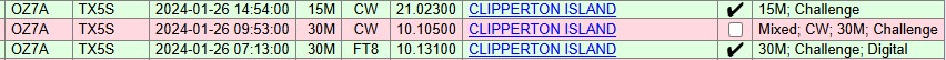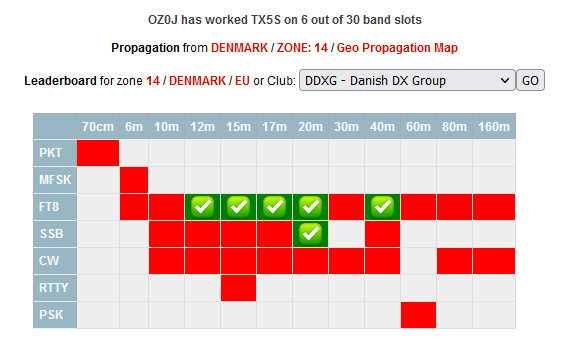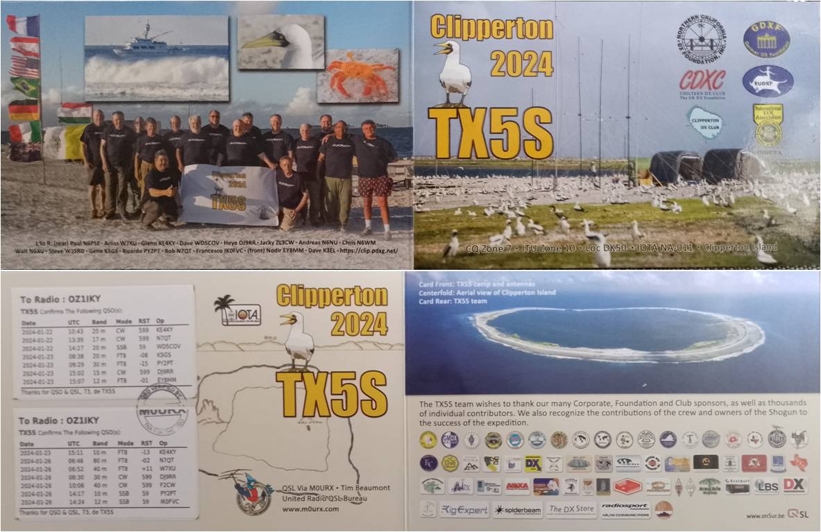 STORT Tillykke med jeres fine scorekort hos TX5S ( Clipperton ). Her var den dog ikke New, da jeg var heldig at få kørt TX5K tilbage i 2013 på 10 + 15M via SSB. Denne gang blev en "smule" bedre idet det blev til 17 QSO´s fordelt på 9 bånd, heraf 7 New Band samt 15 New Bandmode. Jeg var ret så heldig, at være aktiv den dag, hvor TX5S havde valgt, at køre 60M, hvorimod 160M var NIL her.