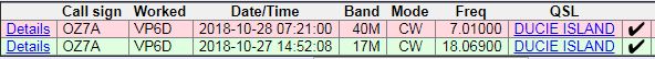 VP6D online log er vist lidt af en rodebutik ... mange af digi mode QSO'erne er ikke i deres logcheck på hjemmesiden, men hvis man slår det op i DXA Appen kommer de frem. Virker som om deres FT8 app ikke altid får logget en QSO korrekt !