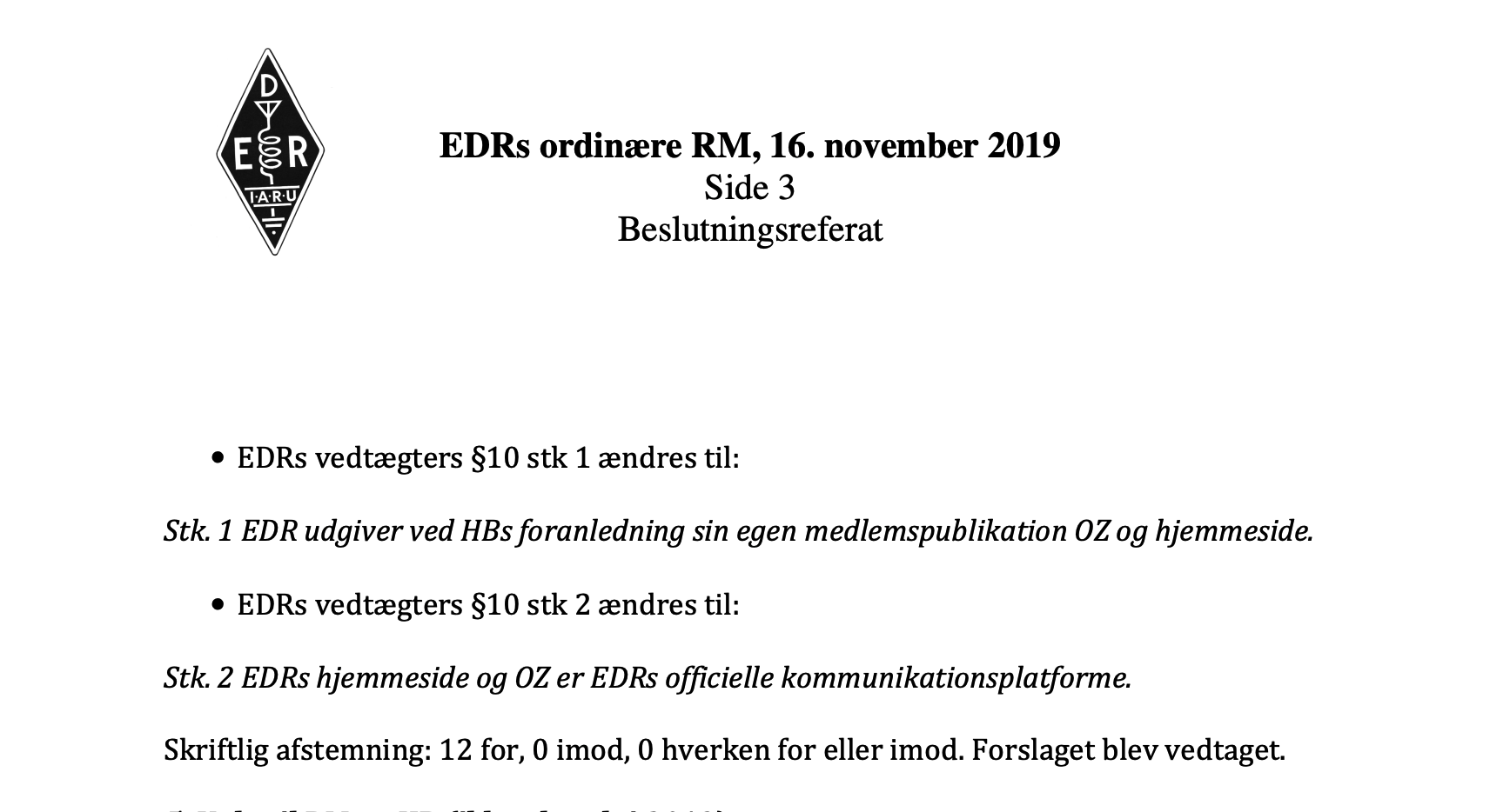 Beslutningsreferatet fra RM 2019 blev efter flere ugers "uddybning" af OZ3MC og OZ1JS lagt ud på hjemmesiden 2019-12-10, hvor det stadig ligger sammen med det underskrevne regnskab.