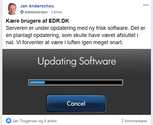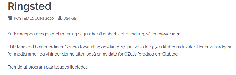 Softwareopdateringen har så bevirket, at et indlæg fra EDR Ringsted er forsvundet. Nu har jeg oprettet det igen, og så må vi se, om det denne gang bliver. Jeg skal da vist til at tage min egen backup for indlæg på https://edr.dk/ for indlæg kan åbenbart forsvinde.