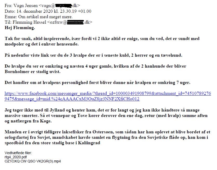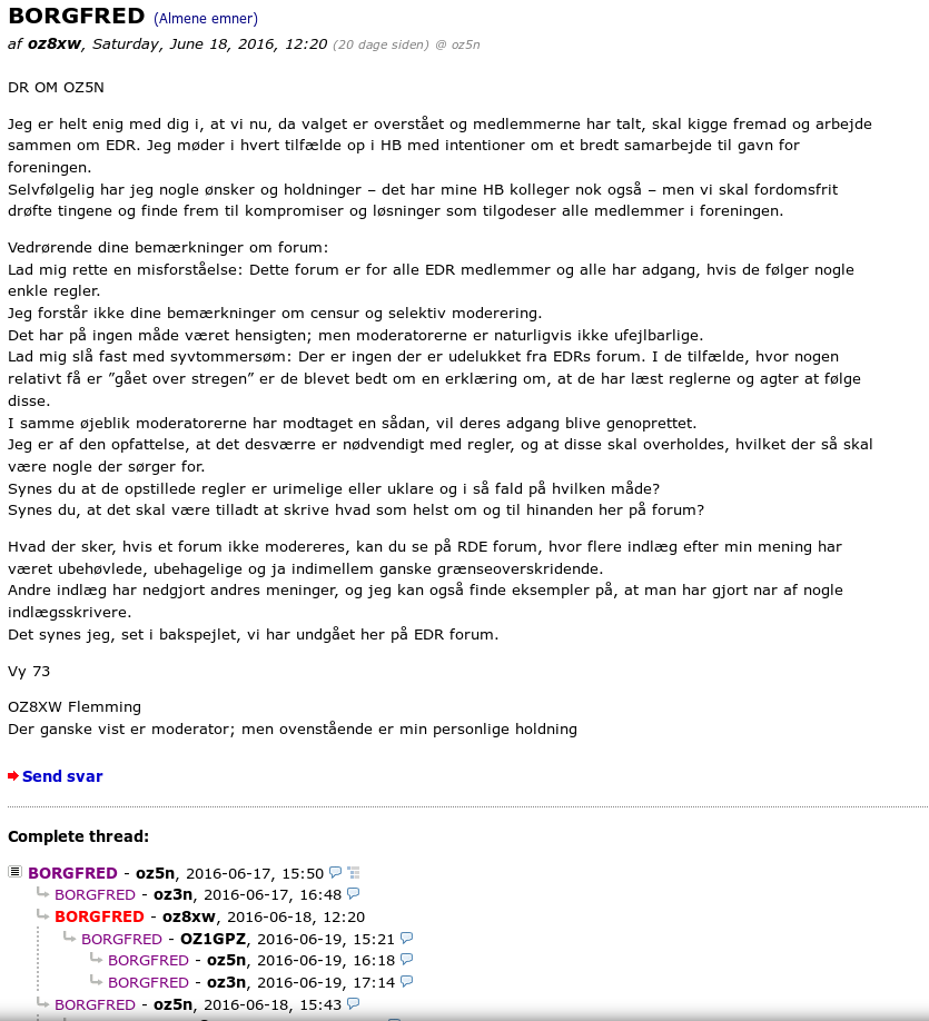Dr Om OZ8XW, jeg kunne skrive meget mere for at besvare dit spørgsmål. Men da jeg ikke tror, at dette vil ændre noget som helst ved din opfattelse af den forfulgte uskyld OZ1OXQ, så lader jeg det blive herved. Dog vil jeg rose dig for, at du ikke gemmer dig i anonymitetens skygge, som andre gør - ingen nævnt, ingen glemt.