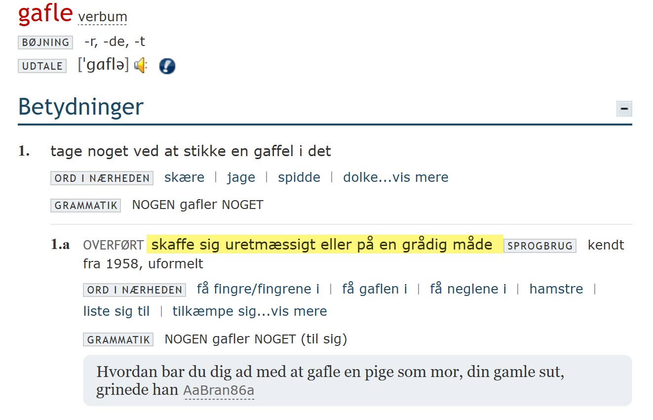 Jeg opsøgte derfor førnævnte værk på dette link: https://ordnet.dk/ddo/ordbog?query=gafle