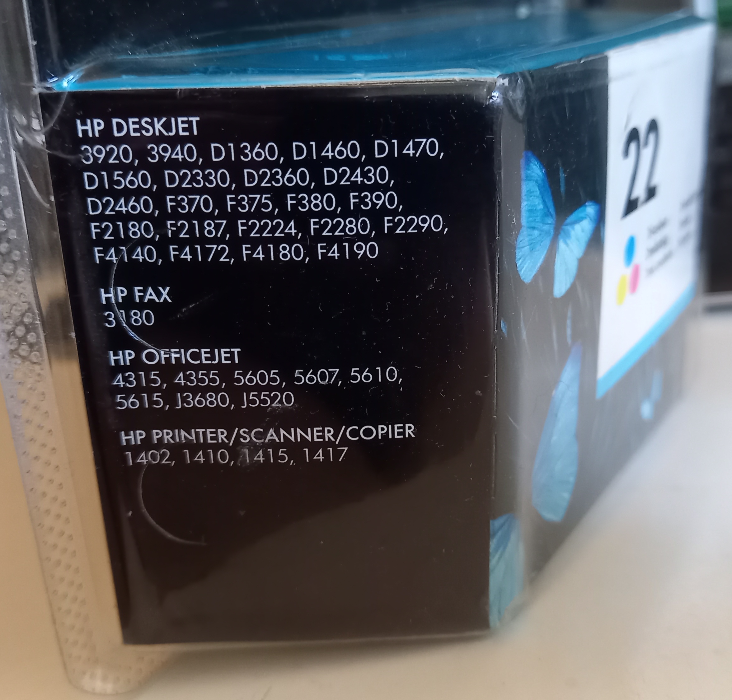 Jeg har denne pakke blækpatroner til salg. Det er HP 22, så det er kun farvepatroner, der mangler sort. Jeg kender ikke standen på patronerne da de ligger i ubrudt emballage og er over 10 år gamle. Derfor den symbolske foræringspris på 1 kr. plus eventuel fragt. Se på billederne hvilke printere patronerne passer til.