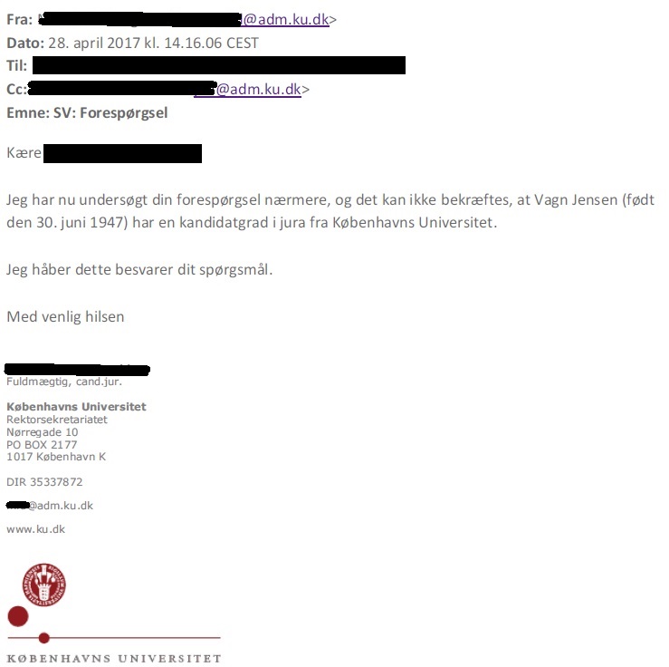 Punkt 3; Når man så ser at der stadig svæver en ubetalt radio (en FT-950) og en ubetalt morsenøgle fra en Broder i Canada, samt ikke mindst i nyere tid en ubetalt bog fra Bjarne, OZ3N. Så kan man vel næppe fortænke os i at vi betvivler et hvert udsagn fra den <person> - og derfor er nogen gået så vidt at de har efterprøvet udsagnet om den påståede Cand.jur.-titel ved Københavns Universitet. Se venligst bilag 3. Svar fra Københavns Universitet, omkring hvorvidt OZ1OXQ, Jensen, Vagn, rettelig kan anvende den beskyttede titel Cand.jur.