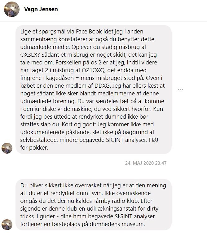 Det svarer du ikke på; men fremkommer i stedet for med en helt masse påstande og oplysninger, der åbenbart skal legitimere din efter min mening nærmest sygelige interesse for OZ1OXQ.