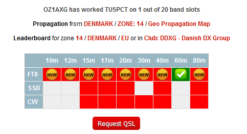 Tjaa ... Så lykkedes at køre TU5PCT på 60M, trods deres manglende "antenne".